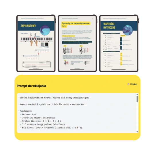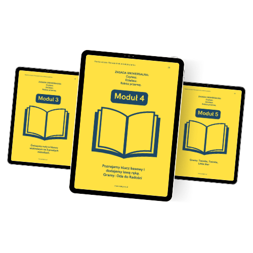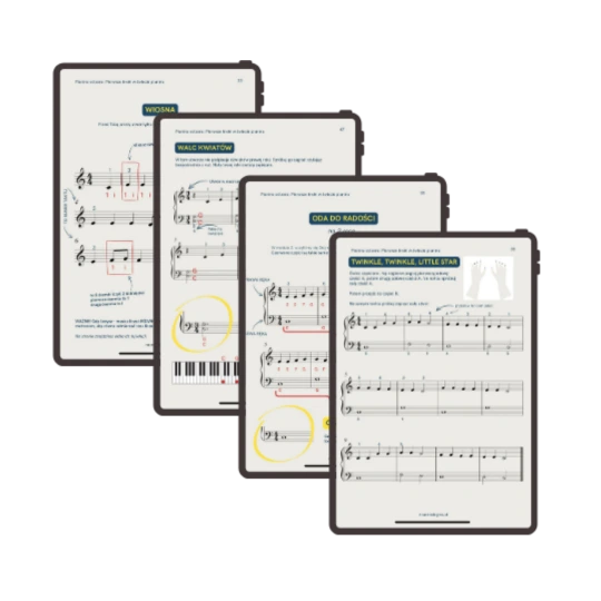 Otrzymujesz ebook, nuty, filmy z klawiaturą, interaktywne ćwiczenia oraz karty wsparcia. Wszystko, czego potrzebujesz, aby zacząć grać świadomie i rozumieć to, co robisz.
